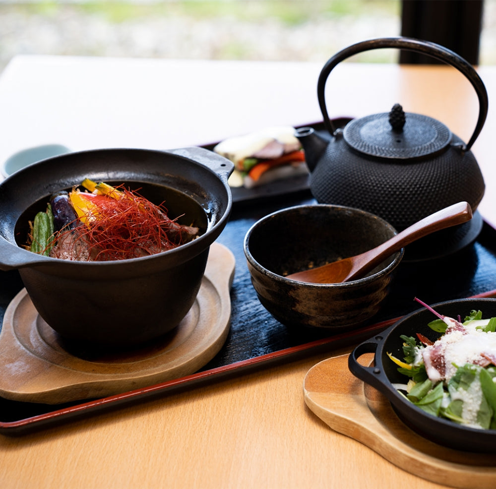 中でもレストランで提供する「七楽!!熟まえさわ」は、ゆっくり美味しいものを味わいたい人に大人気。1週間熟成させた前沢牛の焼き肉丼にステーキ、生ハムサラダ、土瓶蒸し、デザートにブルーベリーアイスなどがついて、なんと2500円。焼き肉丼は半分食べたら、残りをお茶漬けにもでき、二度楽しめるアイデア。これを食べたいためにわざわざ来てくださるお客様も多いとか。器には、前沢牛にふさわしく重厚感ある伝統工芸の南部鉄器が採用され、見栄えもしっかり考えられた高橋さんこだわりのセットメニューである。そして、そんな前沢牛に負けないものとして選ばれたのが『ヨード卵・光』だ。